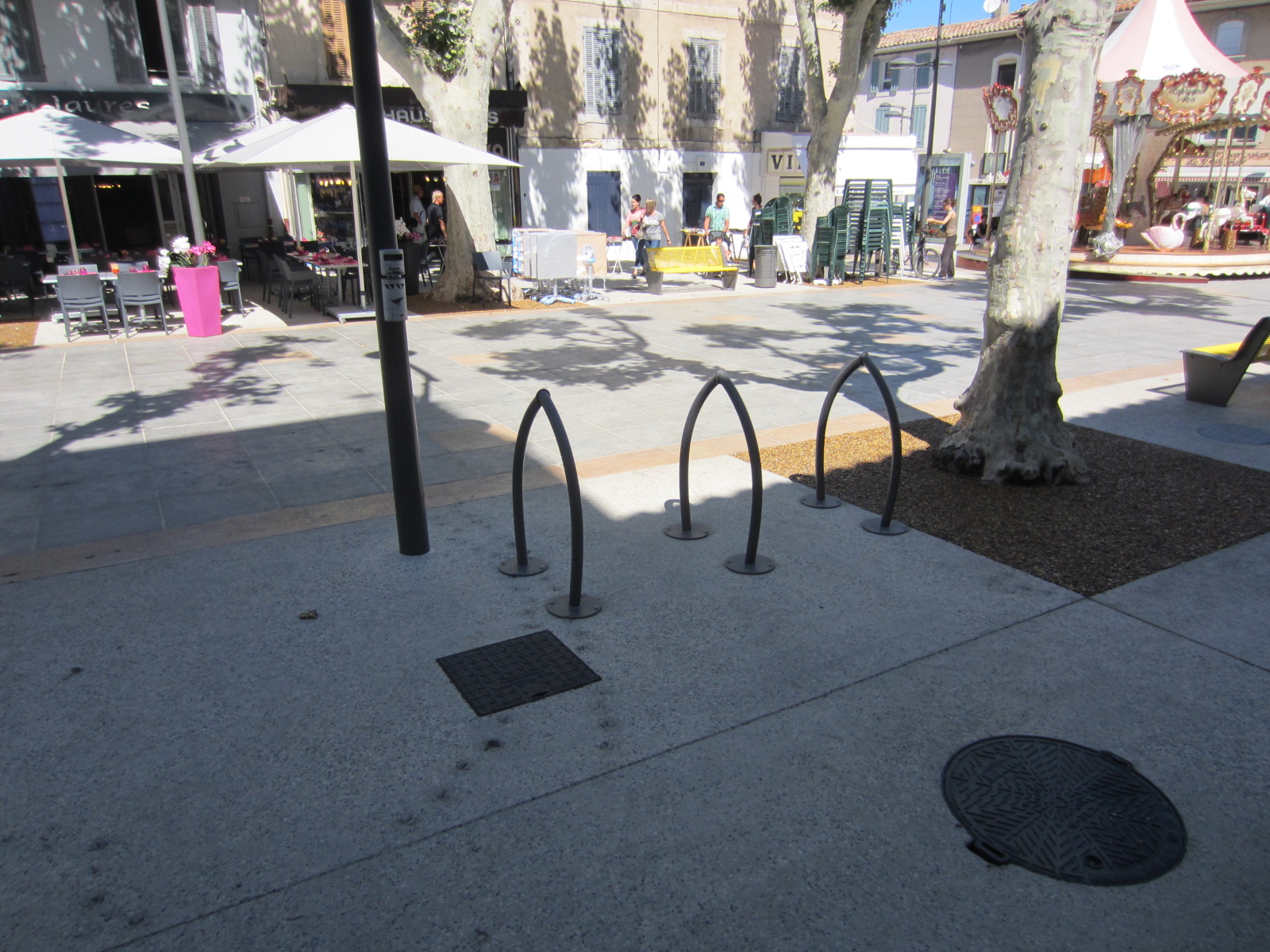 On ne regrettera pas les anciens appuis-vélos de l’office du tourisme (ils ont disparu, voir 1ère photo).