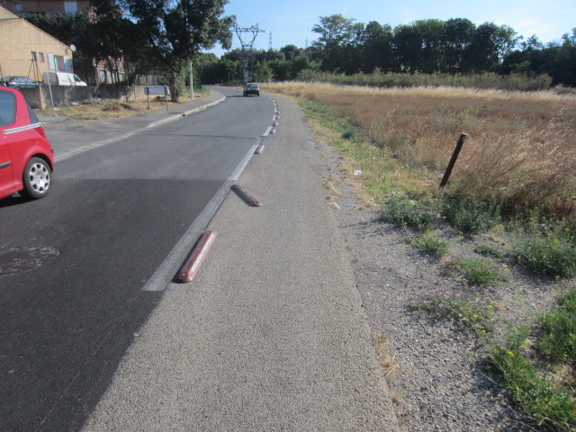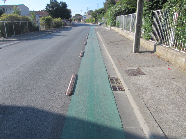 Les exemples ci-dessous se trouvent à Saint-Chamas (1ère photo) et Miramas (2nde photo). Ce sont clairement des bandes cyclables, bien que dans l’esprit des municipalités les « séparations basses » en fassent sans doute des pistes. Si on veut que les cyclistes tombent, ces « séparations » sont idéales, notamment si une voiture est garée en partie sur la bande, et qu’on doit déboîter en passant entre les « plots ». On apprécie l’effort, mais vaut mieux ne pas faire ça et rester aux bandes cyclables simples.