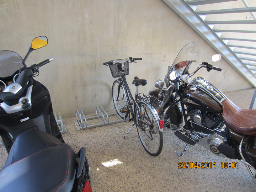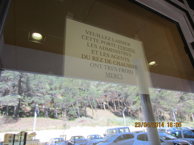 En fait il y a un second râtelier de l’autre coté de la mairie. Au fond du parking sans doute réservé aux employés mais au moins parfois ouvert à tous. Il est vide de moto et de vélo, car il est situé près d’une porte condamnée pour cause de courant d’air. Sa situation assez loin de tout passage ou surveillance visuelle peut aussi faire craindre des vols plus faciles.