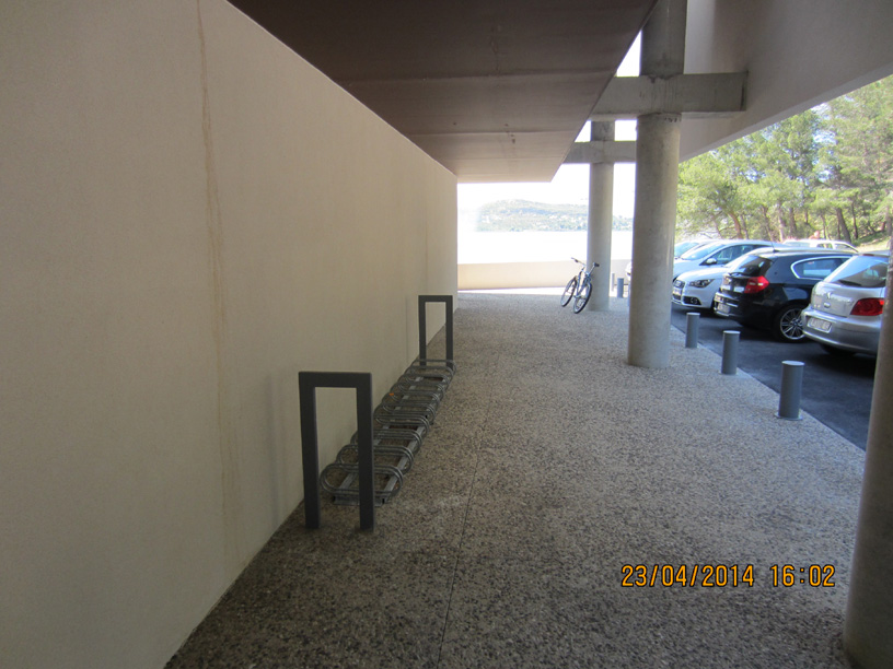Si vous allez à vélo à la nouvelle mairie d’Istres, vous serez sûrement déçu par l’équipement proposé pour les vélo. Il s’agit d’un râtelier « à l’ancienne », c’est-à-dire qu’on y plante sa roue avant, sans pouvoir y attacher son cadre, ce qui ne correspond pas à ce qui est écrit plus haut. En plus c’est peu stable et le propriétaire du seul vélo qu’on y a trouvé ce mercredi 23 avril avait préféré sortir la béquille…