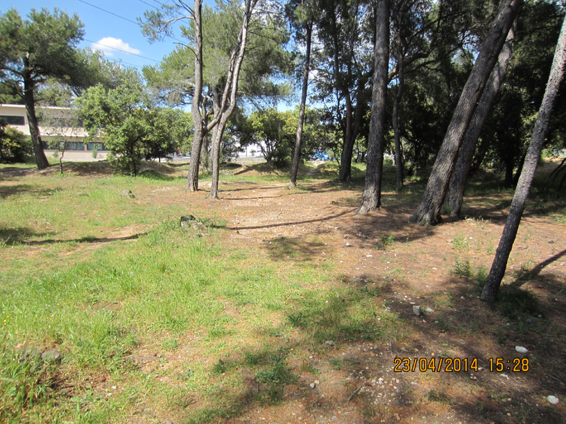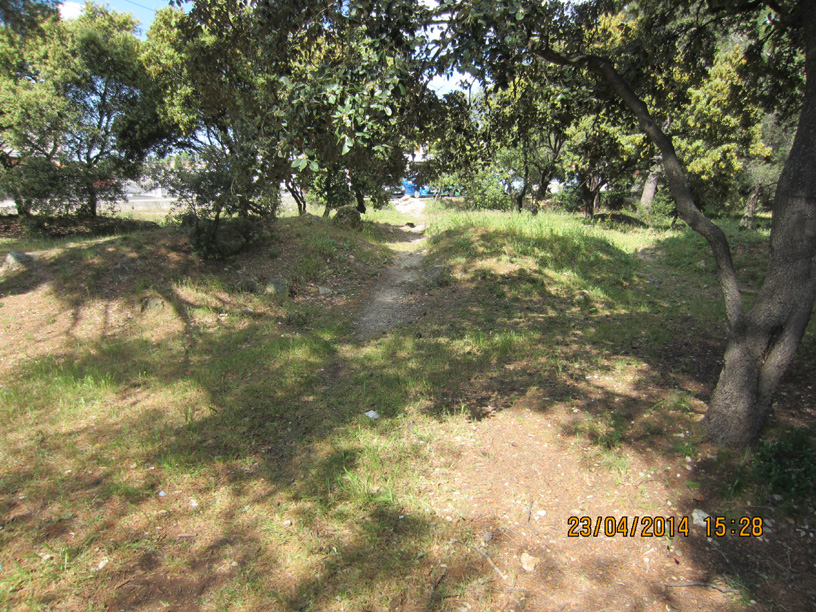 A la sortie du tunnel, la piste goudronnée traverse la petite pinède, mais une trace au sol montre que beaucoup de gens prennent à droite derrière la station service pour aller vers un magasin d’alimentation (DIA), sur 50 m environ. Le chemin sauvage est bien marqué, et jonché de tessons de bouteilles: