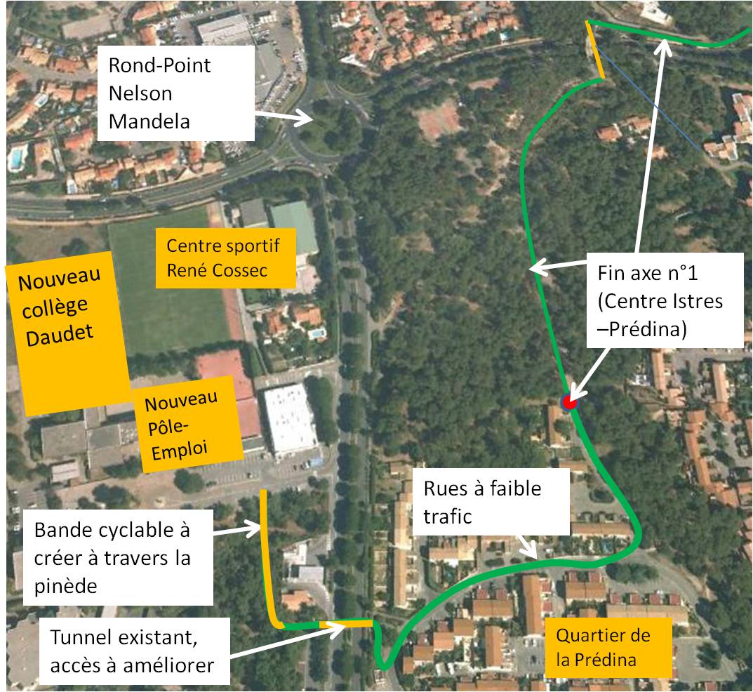 Or, dans le cas du nouveau Pôle-Emploi d’Istres, on s’aperçoit qu’avec un minimum d’investissement, on peut arriver à créer un axe sécurisé pour les vélos pour accéder à ces équipements depuis le centre-ville en passant par le quartier de la Prédina et donc en rattrapant notre axe n°1.