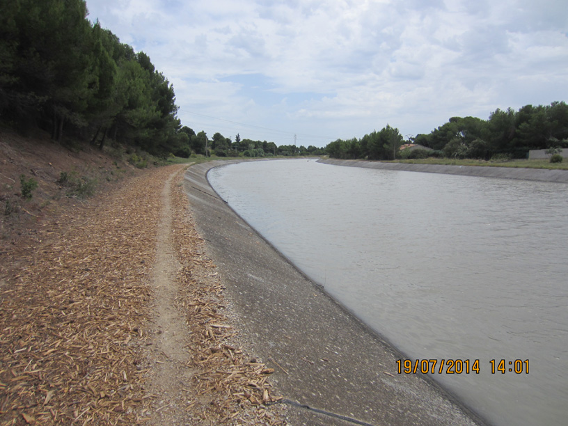On croise sur ces tronçons beaucoup de joggers, surtout autour de Salon de Provence. Les grillages qui interdisent théoriquement l’accès aux rives à partir des ponts ont quasiment tous été percés et on voit clairement que les rives sont fréquentées, car des pistes y sont nettes (voir photos précédentes).