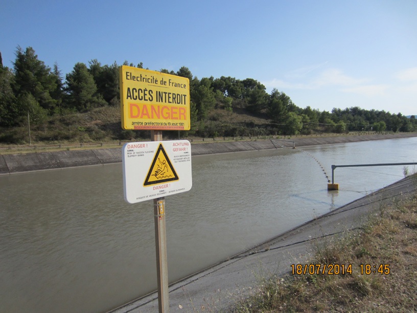 Cet arrêté (demandé auprès des services préfectoraux, nous le joindrons et adapterons l’article quand nous l’aurons) semble avoir été pris pour des mesures de sécurité. Il semble que des gens, des enfants entend-on parfois, soient tombés dans le canal et n’aient pu remonter, noyés ou victime d’hydrocution, ou encore entraînés par le courant. Les berges des canaux sont en effet pentues et lisses, en hiver l’eau est froide et le risque d’hydrocution réel, et si les canaux débitent à 250 m3/s la vitesse de l’eau peut-être importante et empêcher un nageur moyen de remonter le courant.