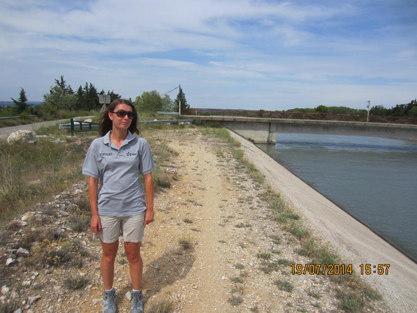 EDF en est d’ailleurs conscient, et cette entreprise emploie en été des « hydroguides » sur ces canaux. Un hydroguide a pour travail d’informer les promeneurs des risques qu’ils encourent dans les lieux « à risque » suite à des aménagements hydrauliques d’EDF. Ce type d’emploi a été imaginé suite au drame du DRAC en 1995 et on trouve la plupart des hydroguides sur les rivières à risque de rapide montée des eaux en cas de lâcher au niveau d’un barrage. C’est le cas en Durance par ex… Mais certains hydroguides sont affectés à des canaux, comme Elodie ci-dessous pour le secteur Saint-Chamas-Mallemort. Son rôle n’est pas de verbaliser (logiquement on y aurait eu droit!) mais seulement d’informer, ce qu’elle a fait nous concernant.