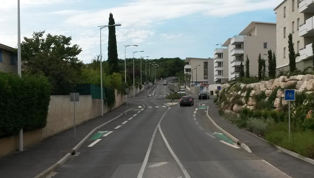 A quoi sert le rond-point? Il dessert un lotissement récent à droite et une voie secondaire à gauche. Il est récent, donc a sans doute été demandé par les riverains pour s’introduire dans ce boulevard, mais un tel rond point est une plaie pour les cyclistes, dans les 2 sens, ainsi que pour les camions ou les bus par exemple. S’il s’agissait de casser la vitesse des voitures, des coussins berlinois auraient peut-être pu suffire, ou carrément des feux à détection de présence, Martigues a su le faire avenue du Grand Gour (la rue avant celle du Décathlon quand on va vers Istres) par exemple, ça aurait été mieux pour le vélos.