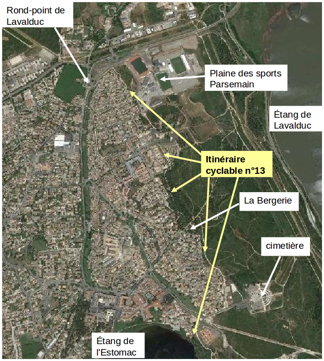 Cet itinéraire est particulièrement agréable : il longe l’agglomération de Fos par l’est et on est souvent en limite de forêt, dont l’ombre est bien agréable en été. Il passe par la salle municipale de la Bergerie et près du cimetière avant de rejoindre l’étang de l’Estomac à hauteur du restaurant O’ Lagoon.