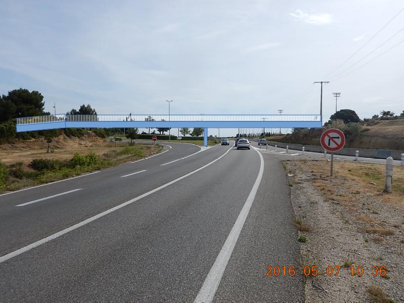 L’arrivée sur la passerelle depuis le nord serait facile à tracer, avec une bonne visibilité pour traverser la route (à coté du panneau publicitaire) :