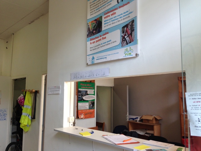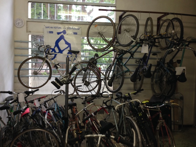 Première visite chez nos amis de l’ADAVA (Aix en Provence). Un atelier de 100 m², assez excentré du centre ville, disons 10 min à vélo pour qui n’a même pas peur des autos. C’est un local en zone d’habitats collectifs, lumineux. Les 100m² ont été vite utilisés, ainsi que 2 caves de 20 m² qui servent pour le stockage. Plusieurs vélos peuvent être réparés simultanément, ça fait envie.