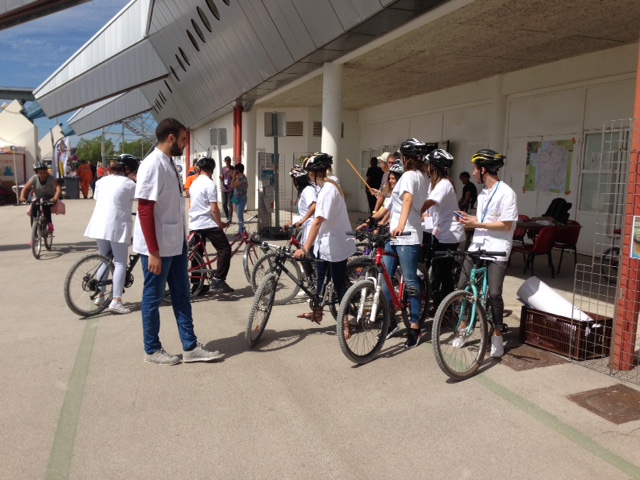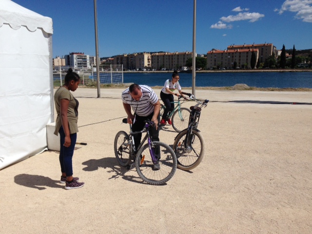 Nous avons mis 10 vélos sortis de notre atelier à la disposition des participants, 2 20 pouces,4 24 Pouces, 4 26 pouces, manière de tester si nos rénovations sont fiables. Une crevaison, une pédale dévissée plus quelques déraillements, mais nos vélos ont fait mille kilomètres.