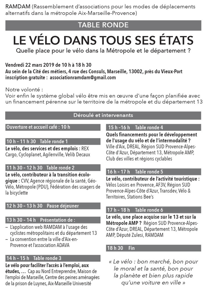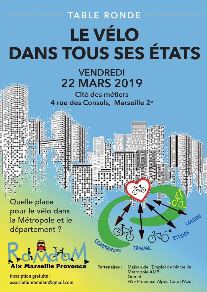 N’hésitez plus, participez à cette journée à la cité des métiers à Marseille le vendredi 22 mars. Journée organisée par l’association RAMDAM, qui nous le rappelons, regroupe toutes les associations de promotion du vélo dans la métropole.