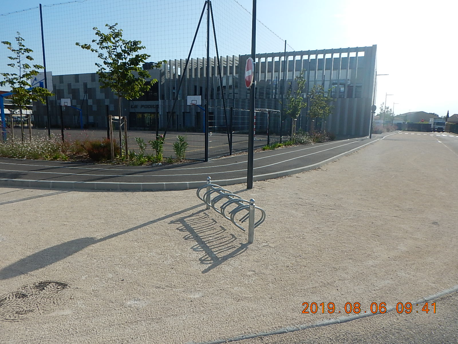 Le gymnase est très récent et a du coûter cher (et beaucoup d’heures d’études). Apparemment personne n’a passé beaucoup de temps sur le parc à vélo, ni l’architecte ni le client (la ville)…