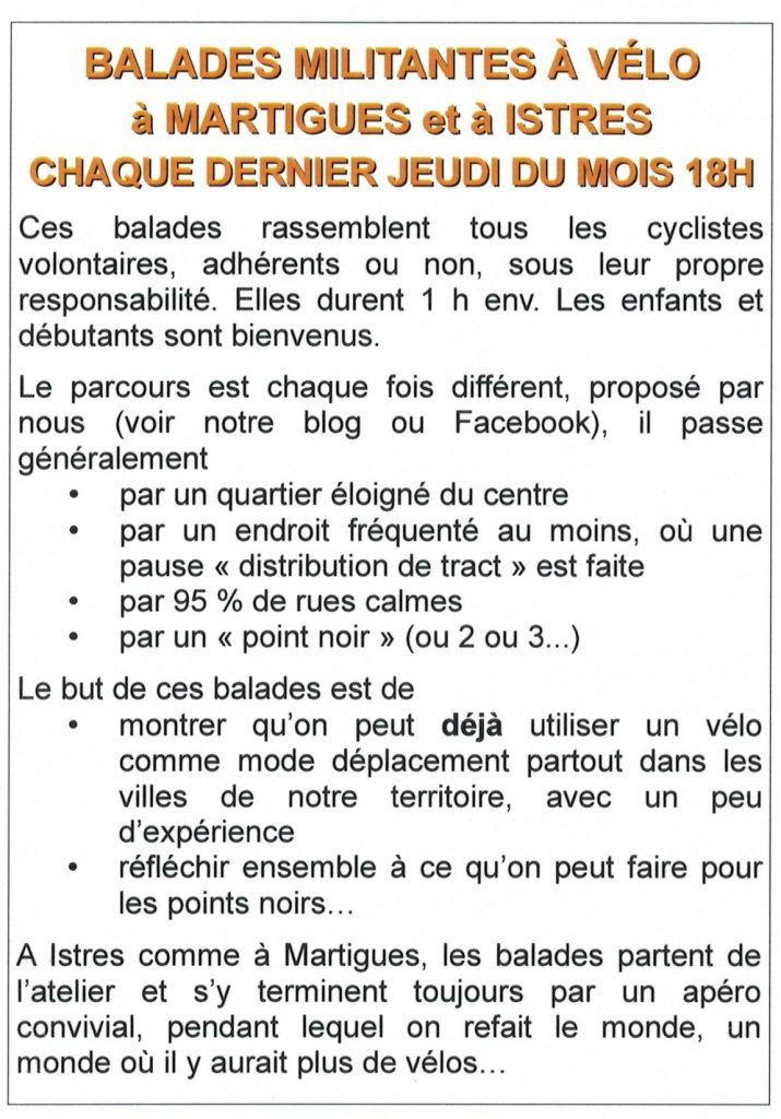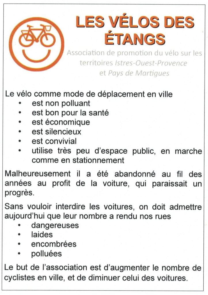 - à Istres, le parcours prévu est ici sur Openrunner. il s’agit d’aller au centre E.Leclerc par un chemin tranquille. On distribuera sur place le petit flyer dont vous trouverez l’image ci-dessous