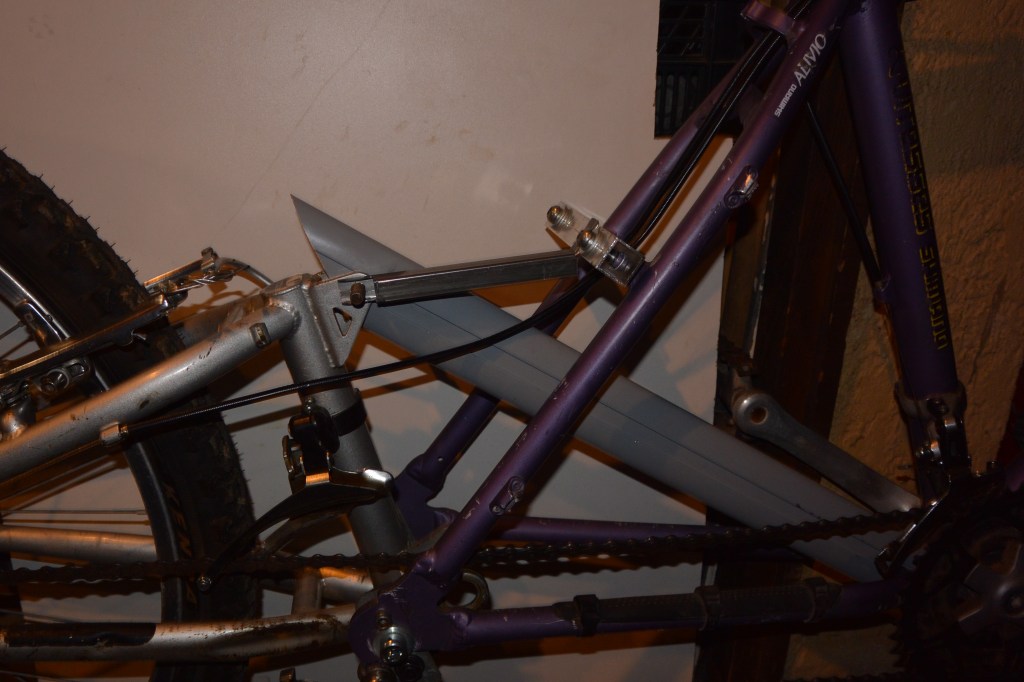 Pour maintenir le bras oscillant et lui éviter de tourner autour de son axe de pédalier, j’ai fabriqué une bielle de maintient à partir d’un pied de table en alu. Ce dernier, en partie haute, est fixé sur la chape de l’amortisseur à l’aide de l’axe d’origine et en partie basse, j’ai taillé un U qui s’emboîte dans le renfort inférieur du cadre du vélo.