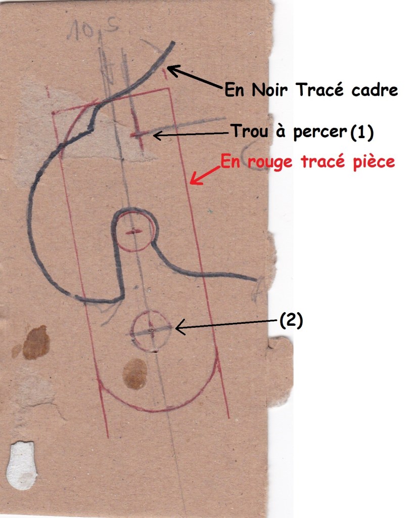 Il sera donc nécessaire de percer un trou ( Ø 6mm) dans les pattes du cadre, en (1), en se servant de chaque pièce comme repère pour tracer l’axe des trous (1).