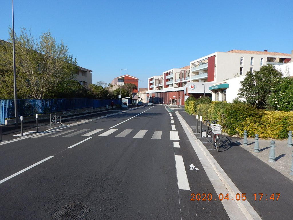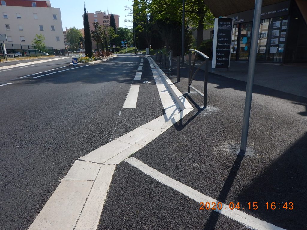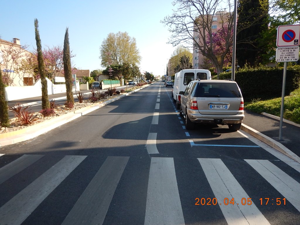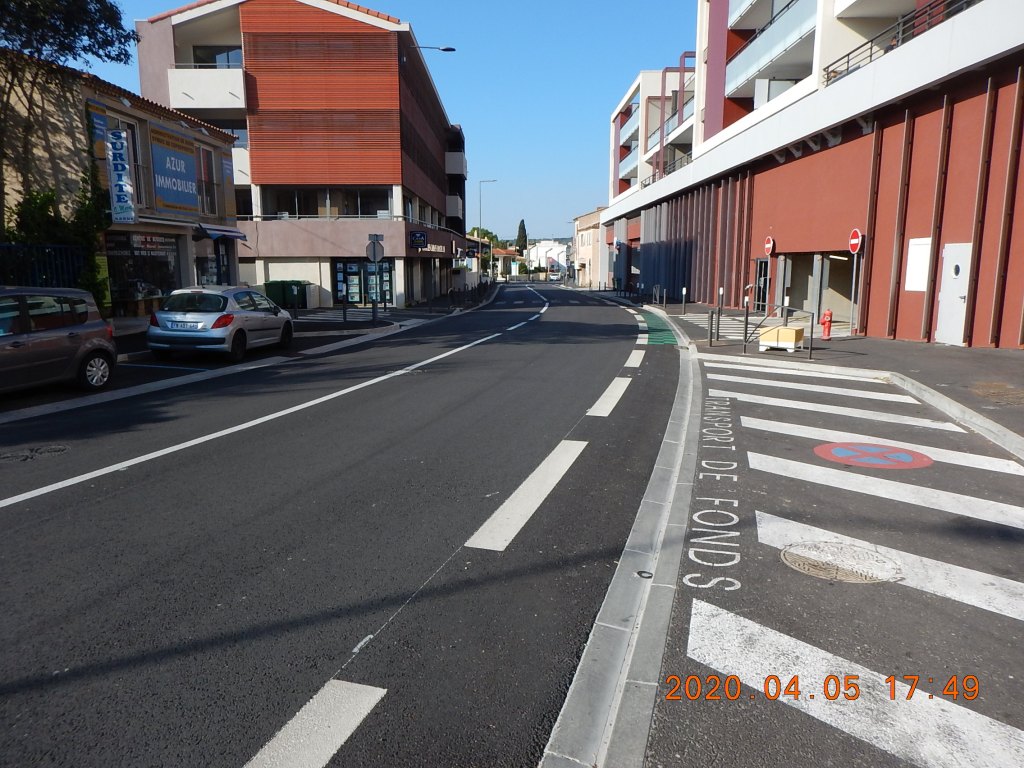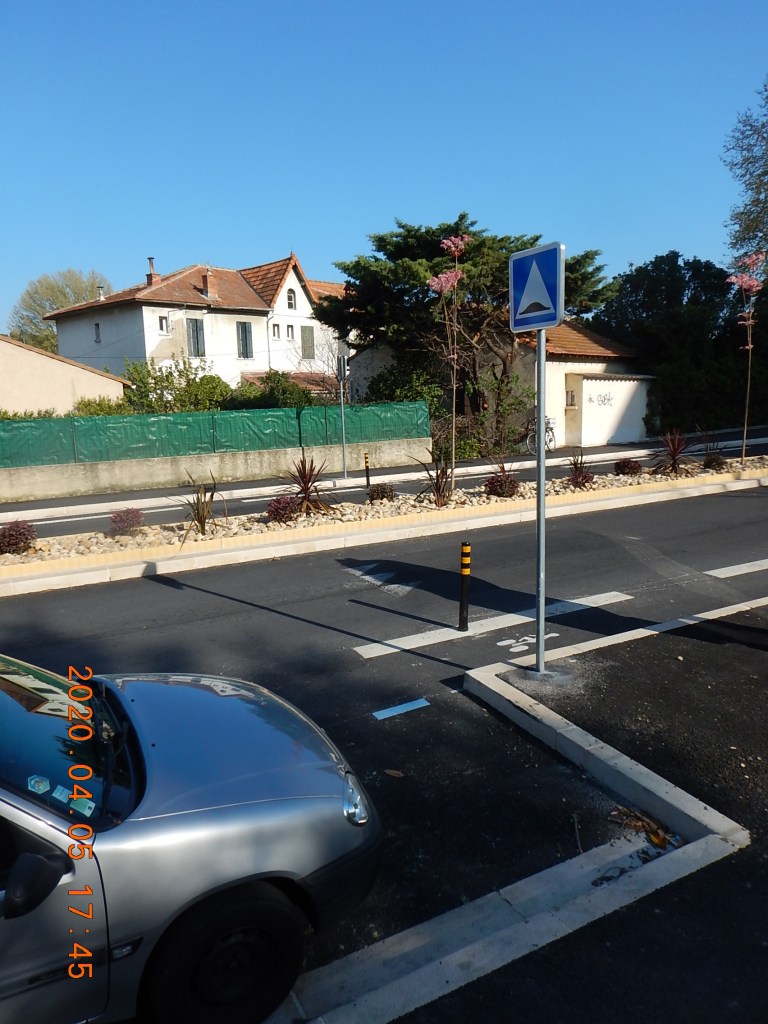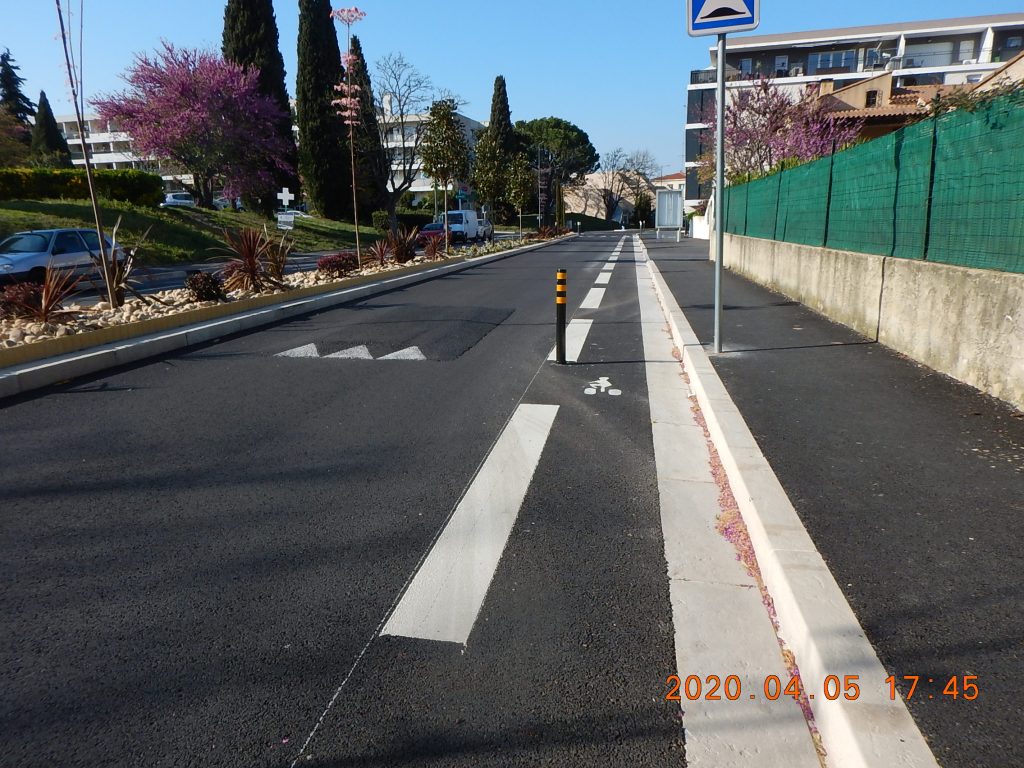 Du fait que tout le boulevard est à 30 km/h, la bande cyclable était à notre avis peu utile. Mais les 30 km/h sont-ils respectés ? Le revêtement à Istres n’indique pas le passage de zone 50 à zone 30 comme ça se fait dans d’autre pays. C’est ce que nous suggérons à la mairie…