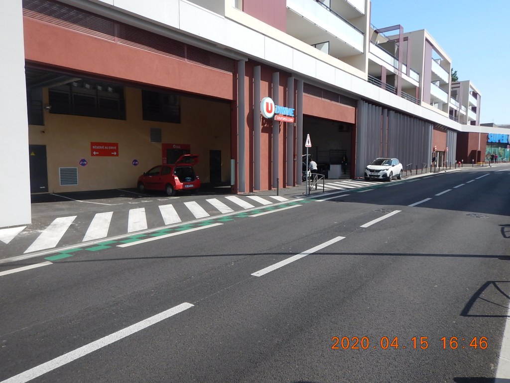 Sur la photo suivante, on constate que la grande surface intégrée au forum des Carmes a prévu un Drive (on est en 2020…) et vu sa conception on sent venir les conflits avec les piétons et les cyclistes… On déplorera aussi qu’il n’y ait pas (encore?) d’arceaux à vélo liés à cette grande surface ni même au forum des Carmes en général.