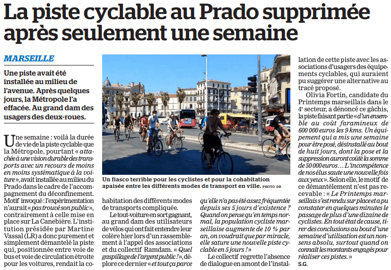 Il semblerait que les politiques aient cédé face à la pression des automobilistes et des CIQ (comités d’intérêt de quartier). Ils ont gagné. Ce qui prouve une fois de plus que le cycliste est sans protection, dans tous les sens du terme. Comment ont-ils fait pour faire céder les politiques ? Après tout ce travail d’étude, de préparation, puis de peinture au sol, de pose de quilles. Tout cela a coûté de l’argent public. Nous pensons connaître la réponse. Les réseaux sociaux des mairies ont été très bien alimentés par les partisans du tout auto, alors que les cyclistes n’ont même pas pensé à mettre le moindre commentaire sur l’intérêt de ces pistes. Et boum, la peur des élections et tout est annulé. https://marsactu.fr/bref/sur-le-prado-plusieurs-centaines-de-velos-pour-denoncer-la-suppression-de-la-piste-cyclable/