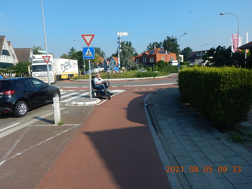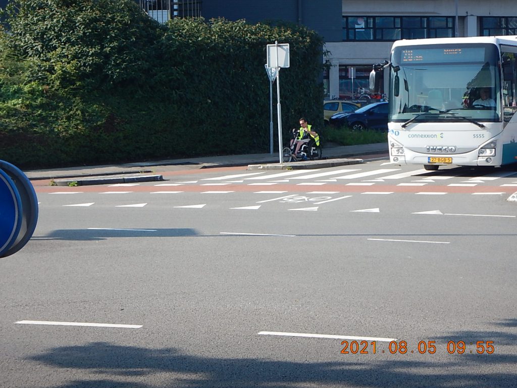 Les handicapés circulant seuls aux Pays-Bas m’ont paru nombreux. Ils circulent généralement sur les trottoirs, mais peuvent utiliser aussi les pistes cyclables. Il faut dire que les pistes sont particulièrement roulantes et assez larges pour qu’un vélo double un handicapé. Les connexions avec les trottoirs sont soignées.
