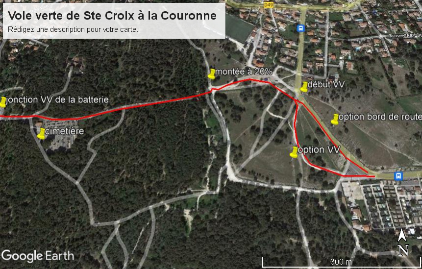 Voici quelques explications illustrées sur l’itinéraire entre Sainte-Croix et la Couronne à partir de ce plan, à droite la route de la Saulce, à gauche le cimetière de la Couronne.