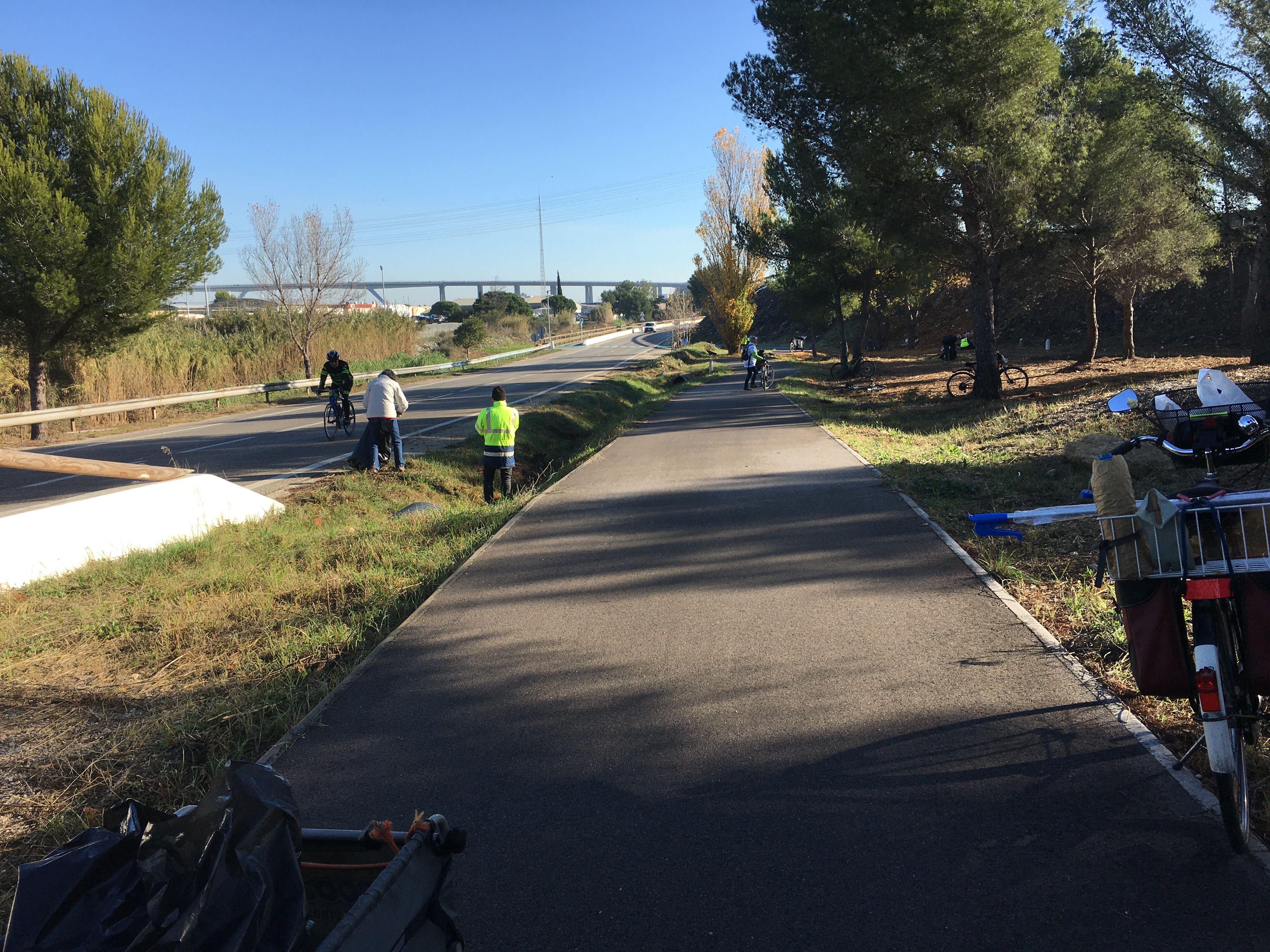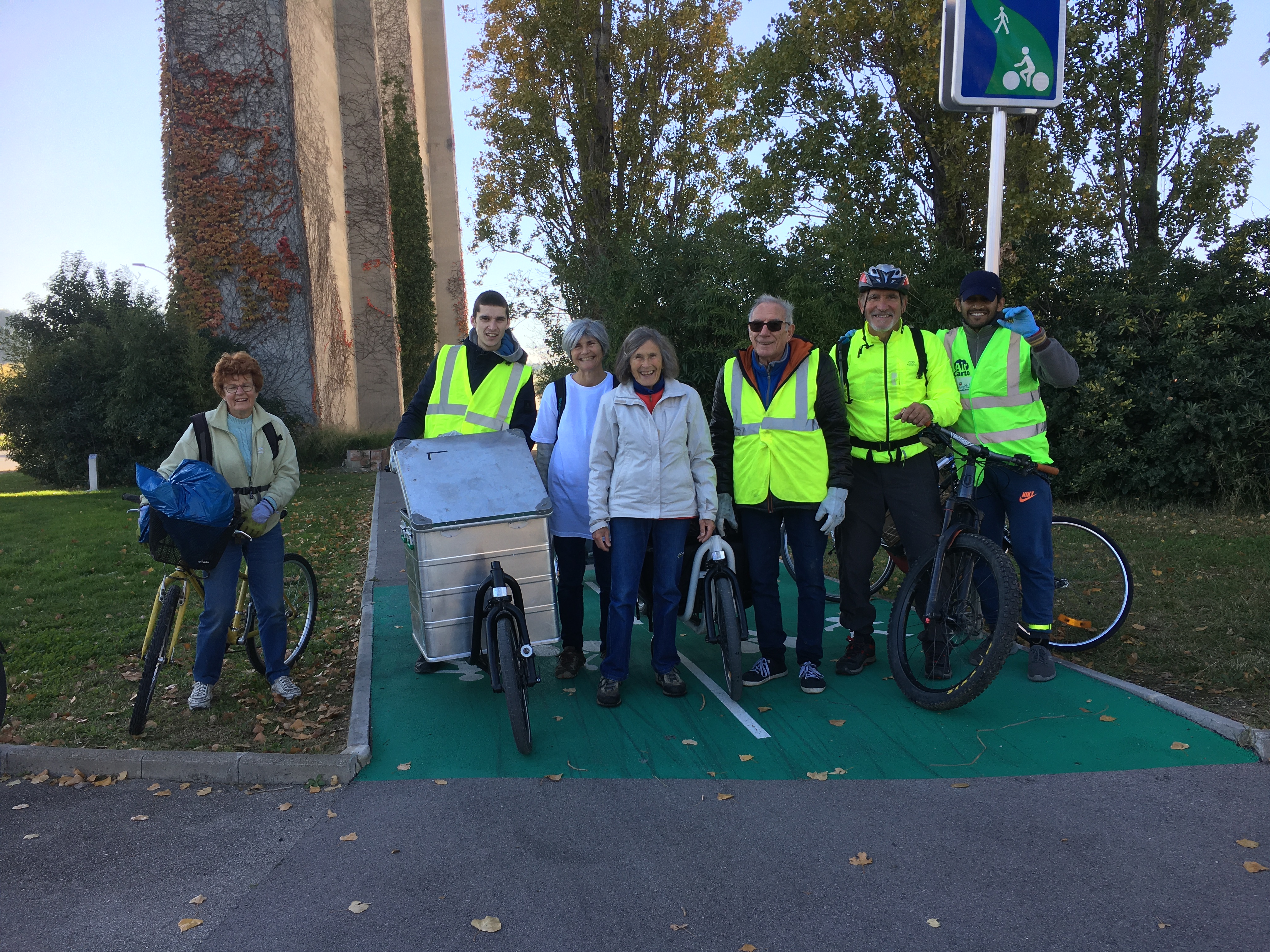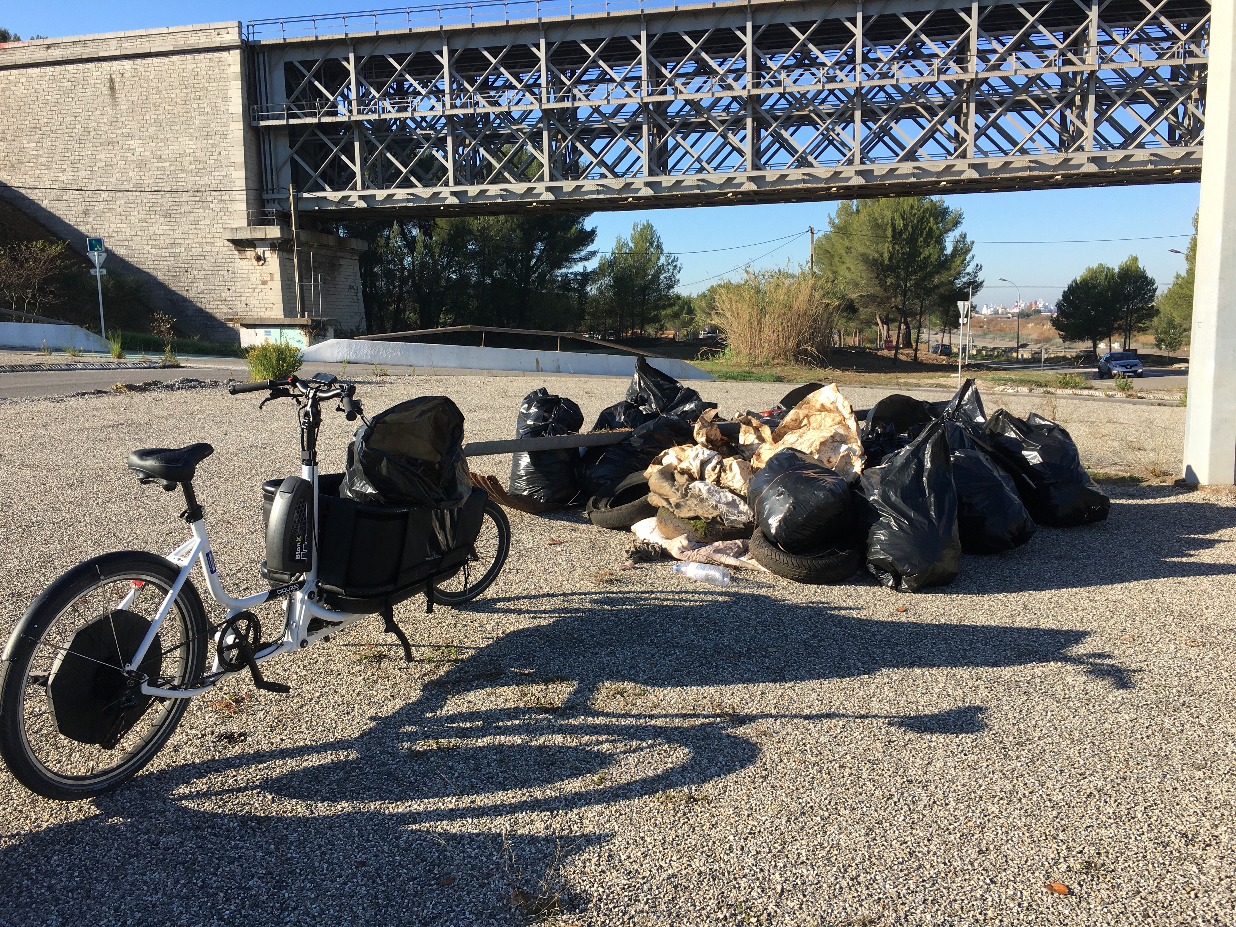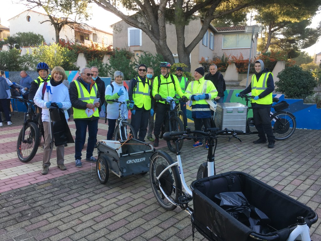 Nos moyens humains et techniques : 12 bénévoles avec chacun son vélo, 2 vélos cargos avec une remorque. Nous avons été rejoints par une dizaine d’habitants de Lavéra qui ont pris en charge les bordures de route.