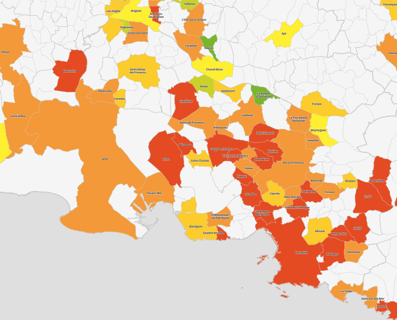 En 2021, cinquante villes des Bouches-du-Rhône ont été notées. Rappelons que les notes vont de 1 (la plus mauvaise note) à 6 (la meilleure). La note moyenne est donc de 3,5.