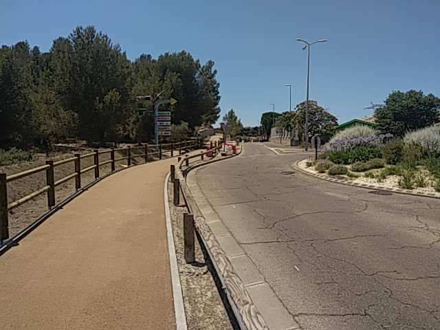 Ici la voie verte est assez longue (1,2 km), les entrées sont assez sûres, et elle permet, dans le sens nord sud, d’éviter une pente rude où les voitures avaient du mal à nous doubler.