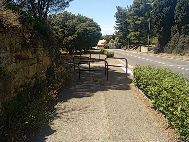 Contrairement à la partie jusqu’ici décrite, dans cette seconde partie il pourra y avoir des conflits entre les nombreux piétons qui montent ce trottoir de l’avenue des Bolles (vers le lycée ou la sous-préfecture), ce n’est pas un problème dans le sens nord-sud où la pente de la montée fait descendre la vitesse des cyclistes à celle des piétons (les cyclistes en VAE restent en général avec les voitures), mais dans le sens sud-nord certains cyclistes pressés choisiront sans doute de passer sur la chaussée avec les voitures.