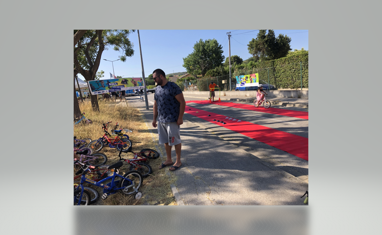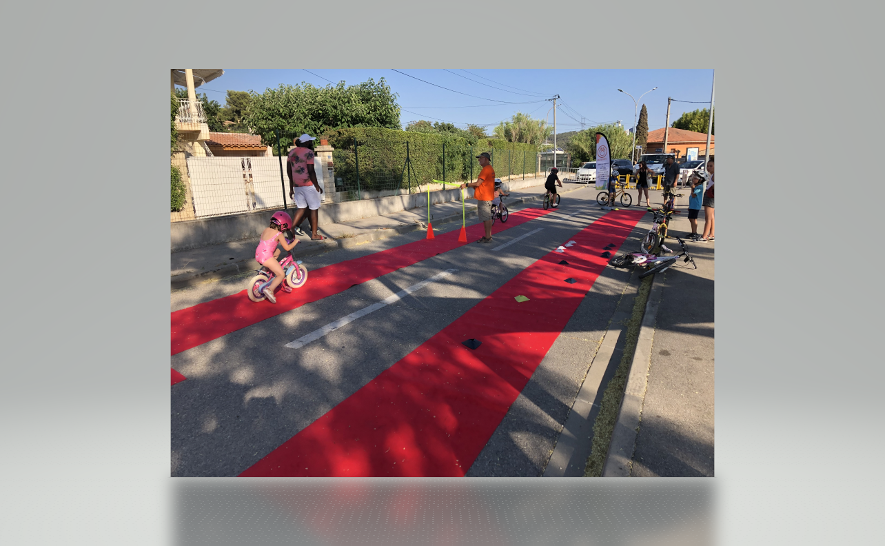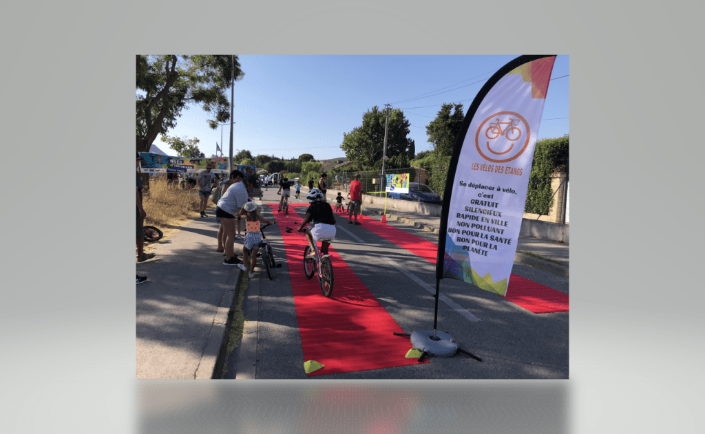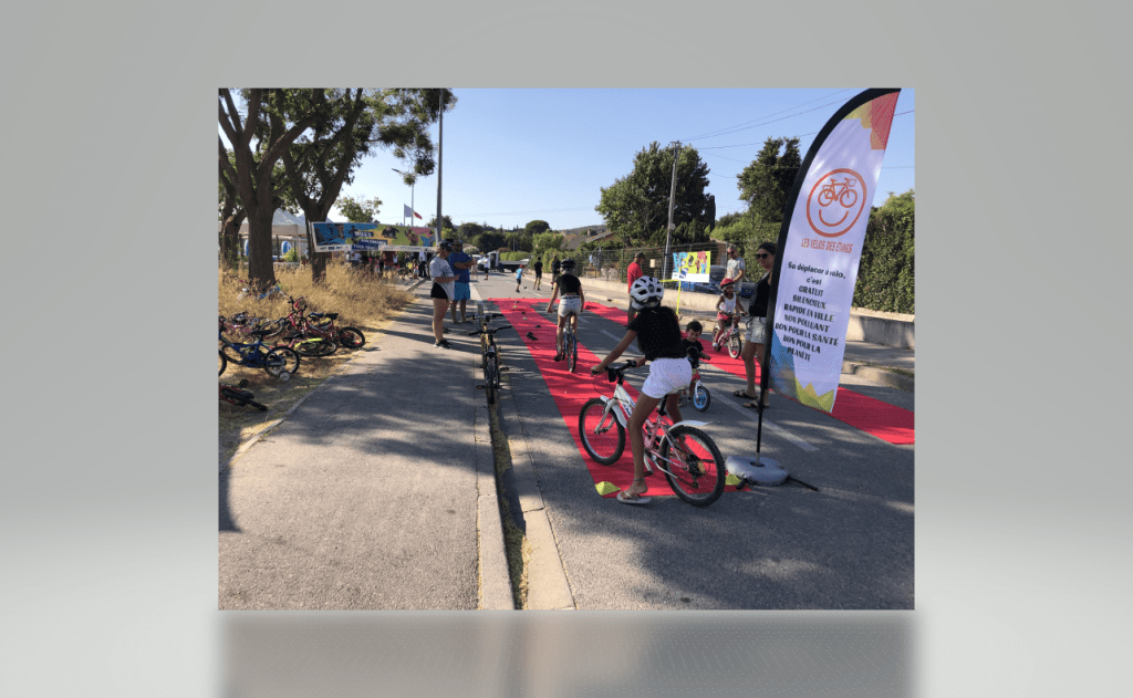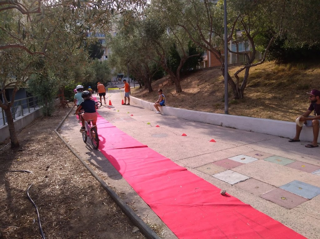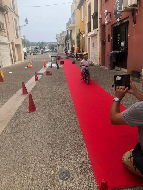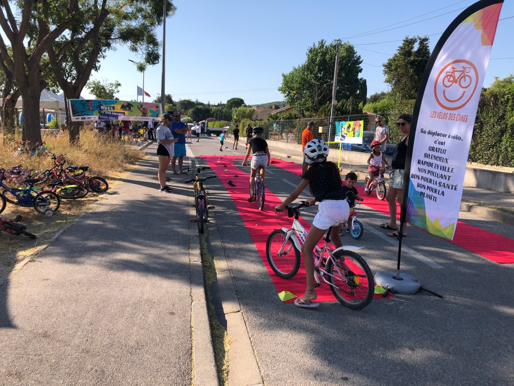 Nous étions le 20 juillet à Saint-Julien-les-Martigues, ce village de campagne fait partie de la grande commune de Martigues. Pour l’occasion, la rue de l’école était interdite à la circulation de 15h à 20h. Au programme, jeux d’adresse, jonglage, diabolo, jeux d’artiste à la craie sur la chaussée, structure gonflable et jeux d’eau (38° à 17h), la médiathèque proposait des énigmes, nous avons proposé une chasse au trésor et déroulé le tapis rouge pour les enfants avec une vingtaine de vélos. Les habitants et riverains étaient réjouis de l’initiative. La Mobilité à St Julien, c’est plutôt par le bus qu’elle passe, le village est situé à 5 km de la ville. La D5 possède de simple bandes multifonctionnelles et rejoint la D49, très circulée et dangereuse au carrefour des Ventrons. Il existe des petites routes (chemins vicinaux) qui permettent de se déplacer loin des autos mais cela rallonge sensiblement le trajet.