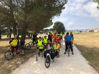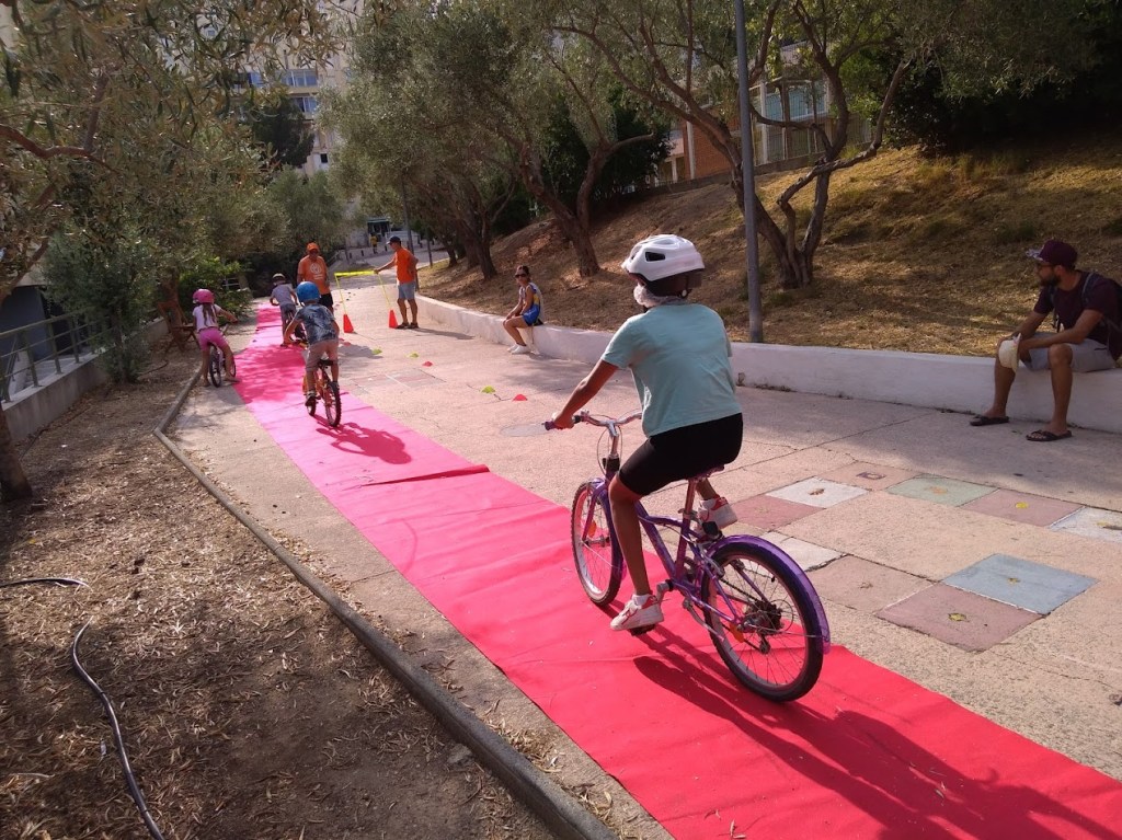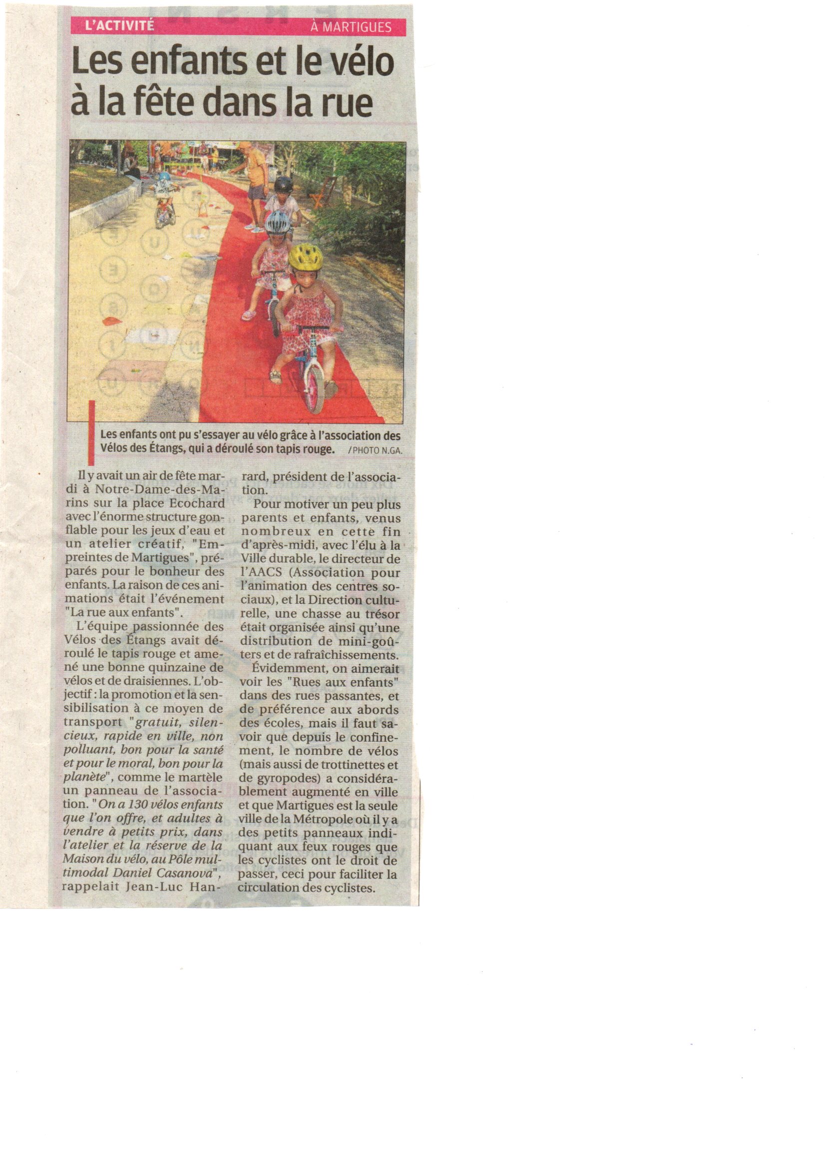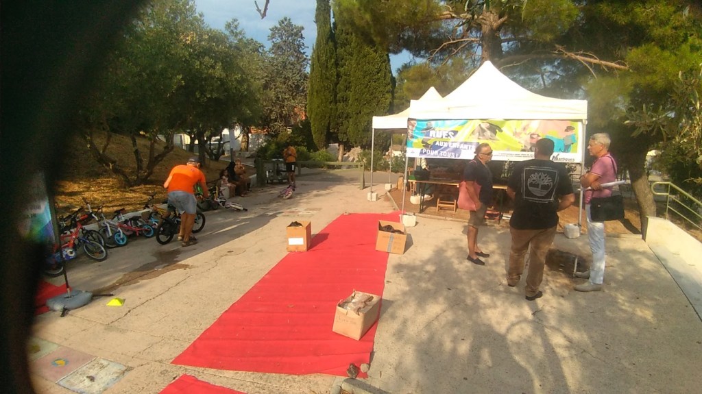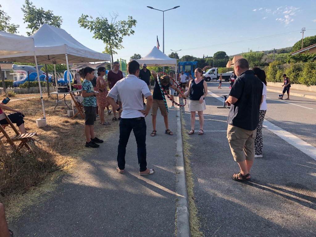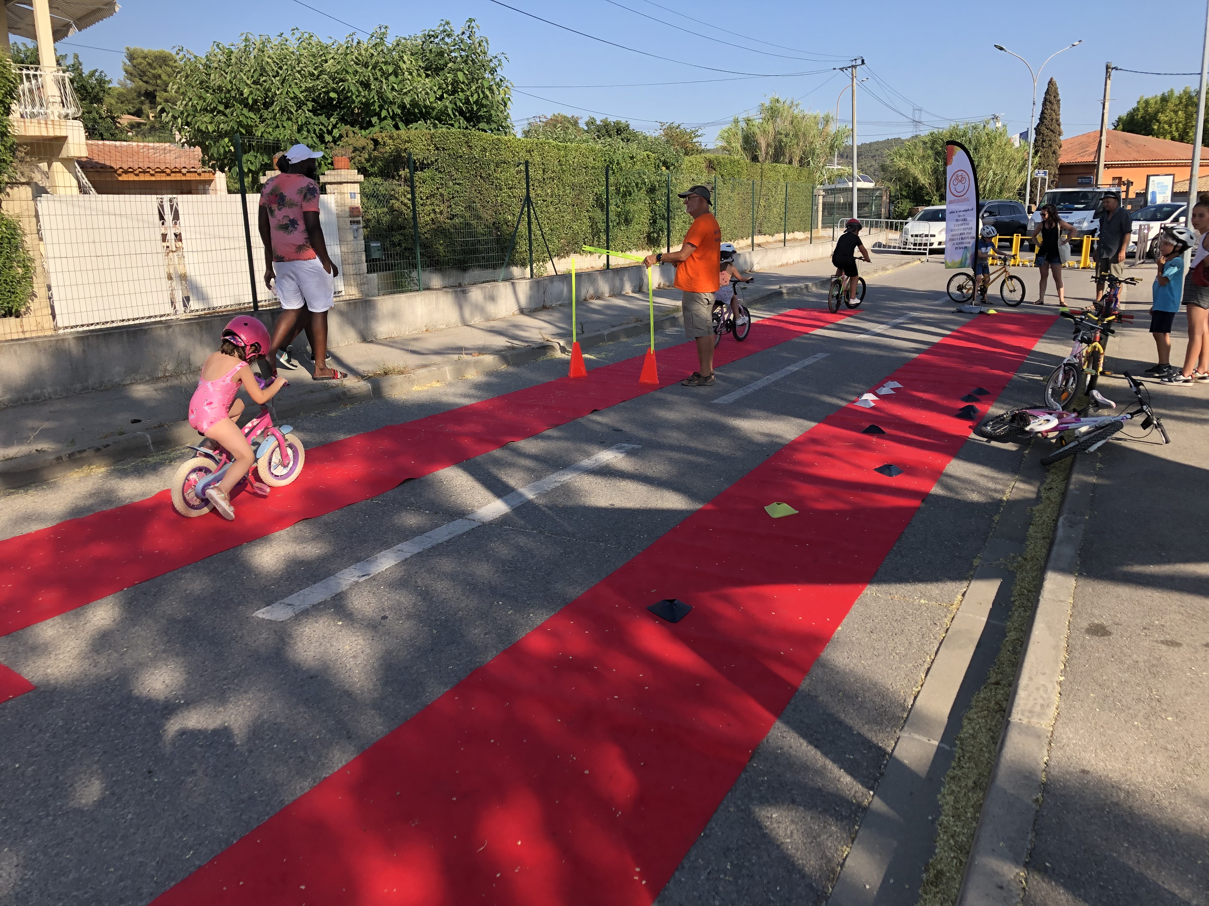 Nous étions le 20 juillet à Saint-Julien-les-Martigues, ce village de campagne fait partie de la grande commune de Martigues. Pour l’occasion, la rue de l’école était interdite à la circulation de 15h à 20h. Au programme, jeux d’adresse, jonglage, diabolo, jeux d’artiste à la craie sur la chaussée, structure gonflable et jeux d’eau (38° à 17h), la médiathèque proposait des énigmes, nous avons proposé une chasse au trésor et déroulé le tapis rouge pour les enfants avec une vingtaine de vélos. Les habitants et riverains étaient réjouis de l’initiative. La Mobilité à St Julien, c’est plutôt par le bus qu’elle passe, le village est situé à 5 km de la ville. La D5 possède de simple bandes multifonctionnelles et rejoint la D49, très circulée et dangereuse au carrefour des Ventrons. Il existe des petites routes (chemins vicinaux) qui permettent de se déplacer loin des autos mais cela rallonge sensiblement le trajet.